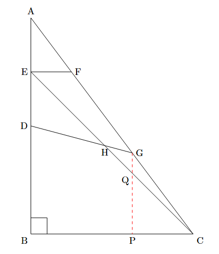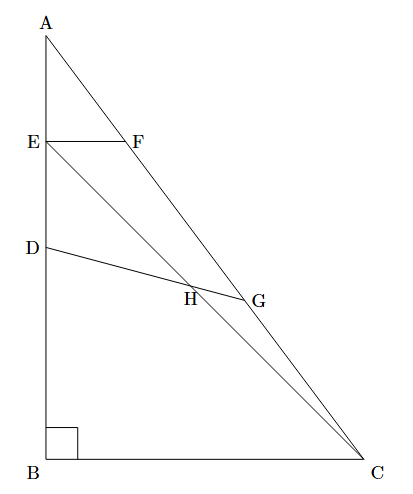 図のような直角三角形ABCがあります. 辺ABの真ん中の点をD, ADの真ん中の点をEとします. 点Eを通り辺BCに平行な直線と, 辺ACとの交わる点をFとし, FCの真ん中の点をGとします. また, 2点EとC, DとGをそれぞれ結び, ECとDGの交わる点をHとします. 次の問に答えなさい.