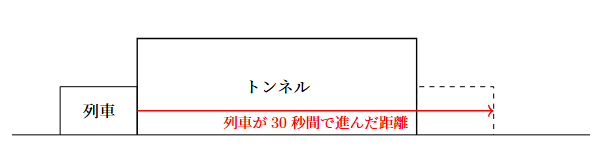 早稲田佐賀中学校【算数】入試問題に挑戦!〜2025年度1月入試〜[大問1-(5)-通過算] 中学受験算数 Twitter Facebook はてブ Pocket LINE コピー 2026.03.182025.12.14 目次 問題解説 問題 長さ130m, 秒速14mの列車が$\square$mのトンネルを通過するのに30秒かかる. 解説 以下のように状況を図示すると, 列車が30秒で進む距離は, $14\times 30=420\ \text{(m)}$なので$\square=420-130=$$290$mとなります.