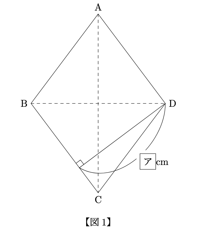 【図1】の四角形ABCDは1辺の長さが$5\text{cm}$の菱形で, 対角線の長さは$\mathrm{AC}=8\text{cm}$, $\mathrm{BD}=6\text{cm}$である.