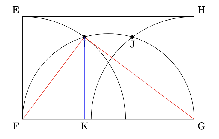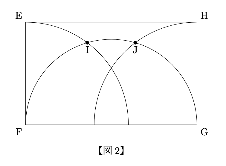【図2】の四角形EFGHは$\mathrm{EF}=30\text{cm}$, $\mathrm{EH}=50\text{cm}$の長方形である. 四角形EFGHの内部に図のようにEF, GHを半径とする扇形を描き, さらにFGを直径とする半円を描く. そのときにできた交点を図のようにI, Jとするとき, 次の各問に答えよ.