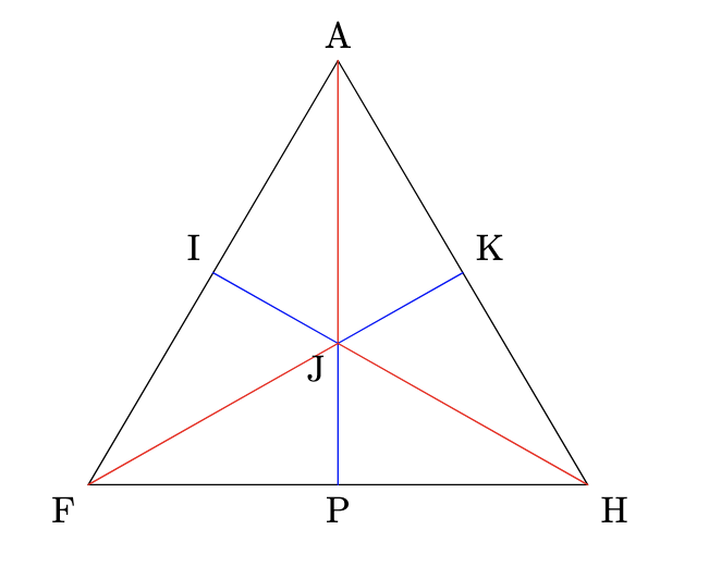 正三角形が面積の等しい6個の三角形に分けられるので, 面積比は$(1+1):6=$$1:3$となります.(四角形AEGCを利用すると$\mathrm{AJ}:\mathrm{JP}=2:1$と分かるのでそちらを利用してもOK)
