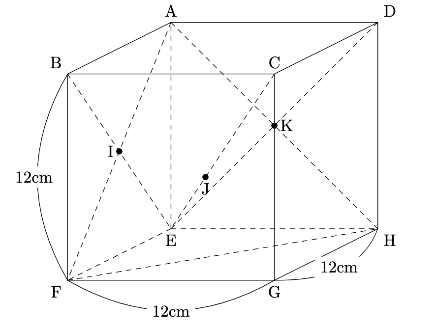 $1$辺が$12\text{cm}$の立方体ABCD$-$EFGHの内部にある四角錐E$-$ABCDを平面AFHで切った切断面を四角形AIJKとする. 四角錐E$-$AIJKの体積を考えるとき, 次の問に答えよ.